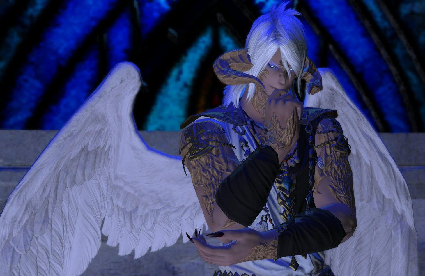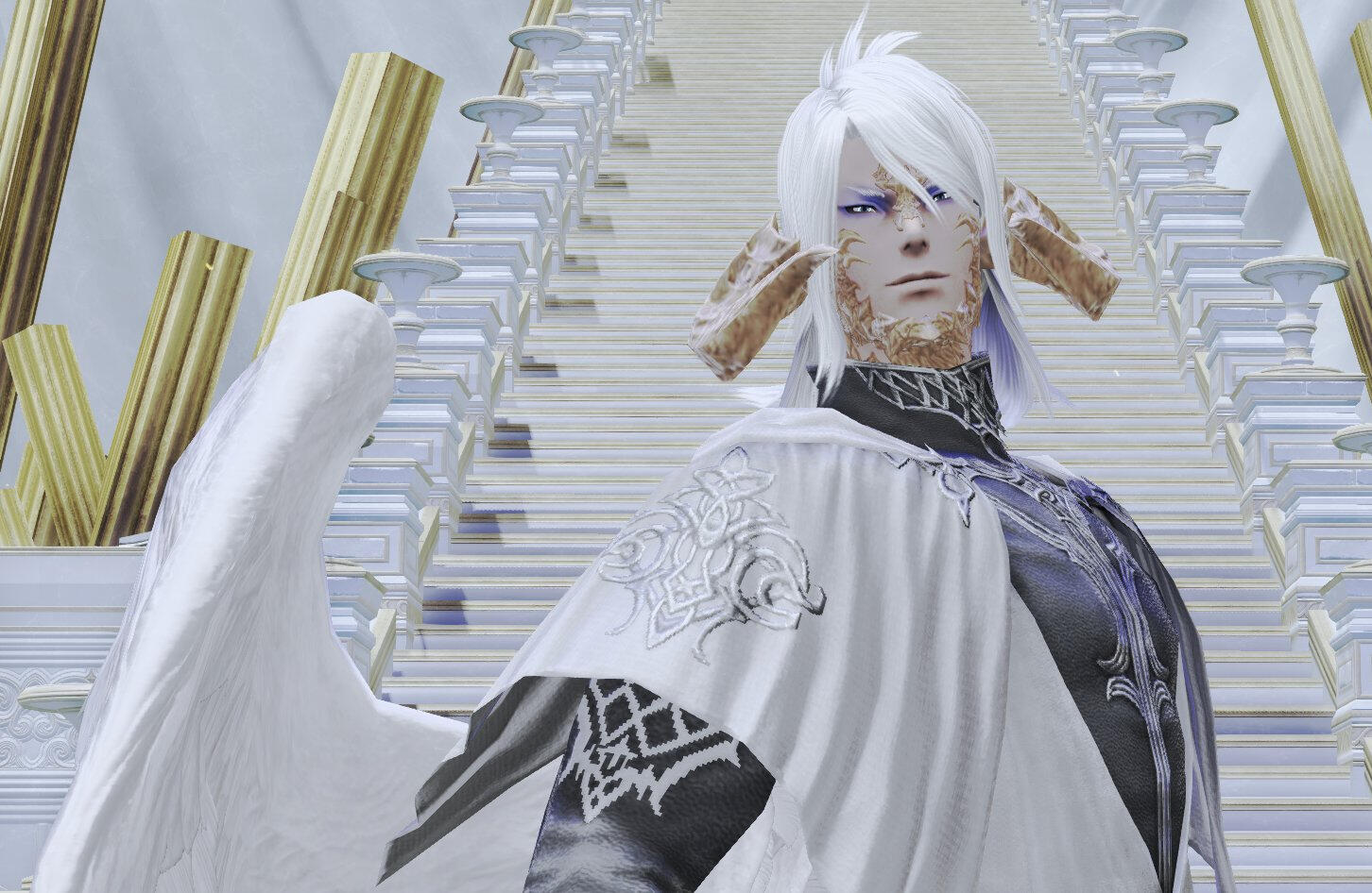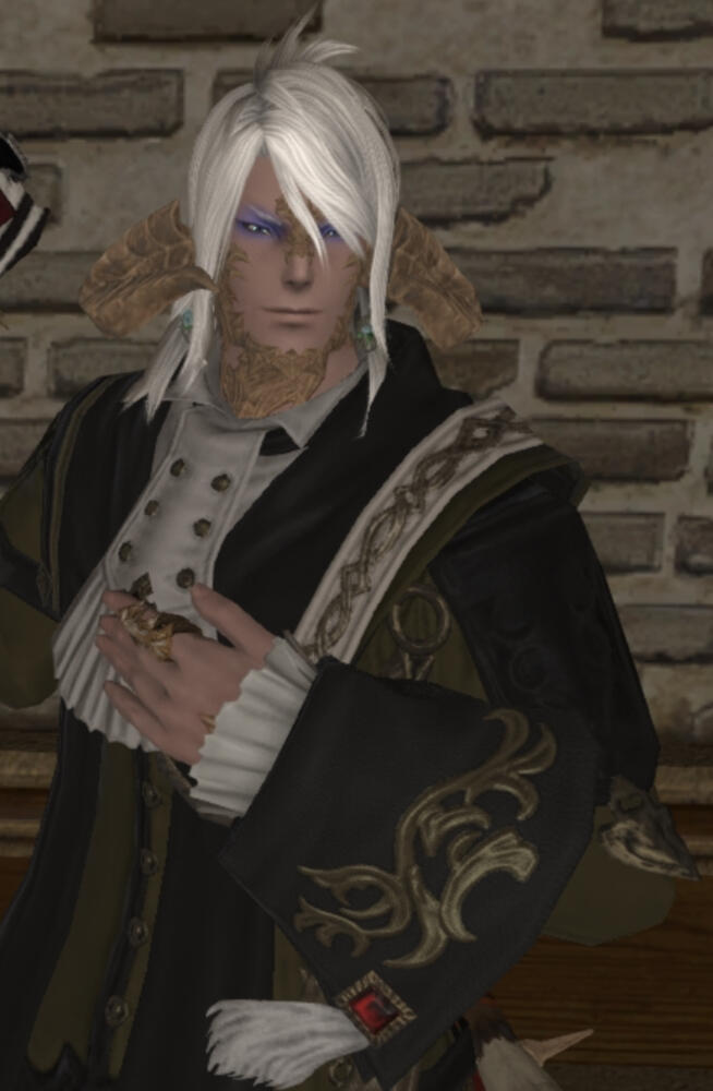 Physical description: At a height of 7'1" with a spiky tail and an almost permanent resting bitchface, this Au Ra makes for quite the imposing sight. His hair is white, a touch messy, and goes down to his shoulders, tumbling over a pair of horns that curl in towards his face. The eyes set into said face are a bright, intense glowing blue.As though his height didn't make him intimidating enough, his manner of speech is immensely formal, sometimes even dipping down into being archaic. Though, if you can get past that, you'll find him to be incredibly charismatic, if a touch odd at times, and all-too happy to share a pint or three over discussing adventures. If you're lucky, you might even see his soft side that he reserves almost solely for children.Though appearing to be a normal (if a touch intimidating) Raen Au Ra, he's actually a primal who has taken over the body of one. As a result, much of his aether is masked, so unless you're one skilled in seeing/sensing aether, you would just see him as a somewhat odd-acting Au Ra.